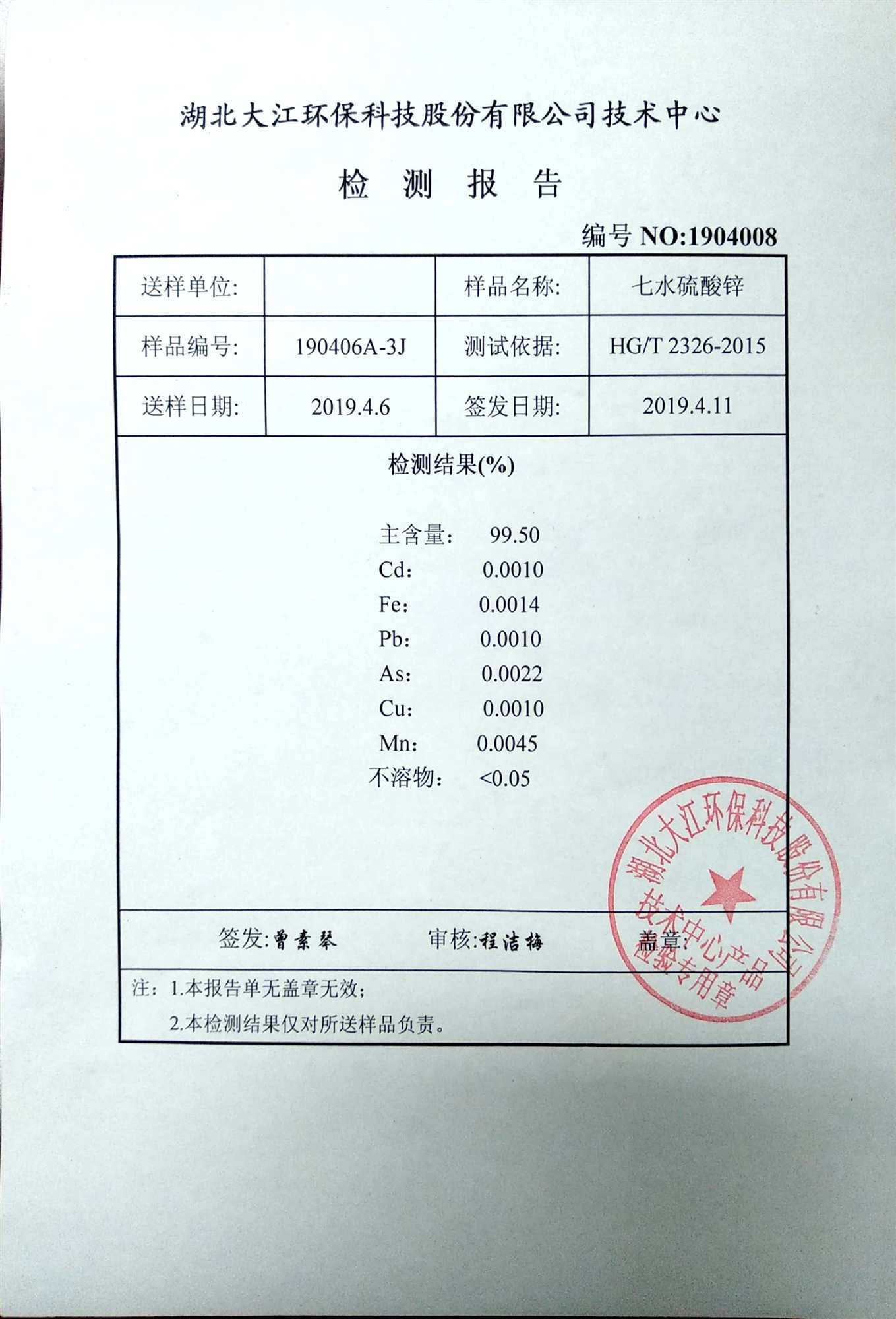 我公司生产 “铜草花”牌七水硫酸锌,产量:15000余吨/年;产品级别为:工业级;执行标准为:HG/T 2326-2005,工业硫酸锌Ⅱ类一等品;ZnSO4·7H2O主含量≥99%(Zn含量≥22.6)。水不溶物≤0.02%、铅(Pb)含量≤0.002% 、镉(Cd)含量≤0.002%、砷(As)含量≤0.005%、铁(Fe)含量 ≤0.005% ;包装为50公斤/袋的内塑外聚丙烯编织袋。我公司年产23000吨。